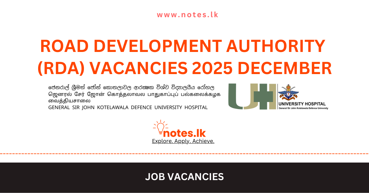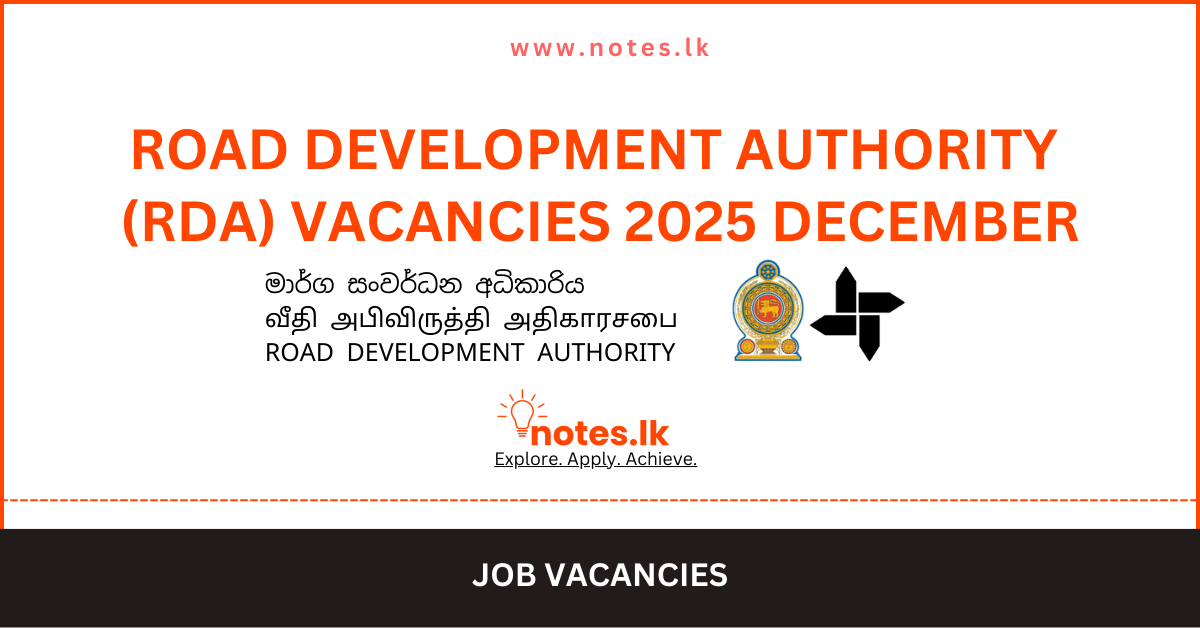 Job Vacancies at Road Development Authority (RDA) – 2025 DecemberChief Engineer (Projects)Quantity SurveyorTechnical OfficerDraughtsmanLaboratory Assistant Go Study ! Study anything ...