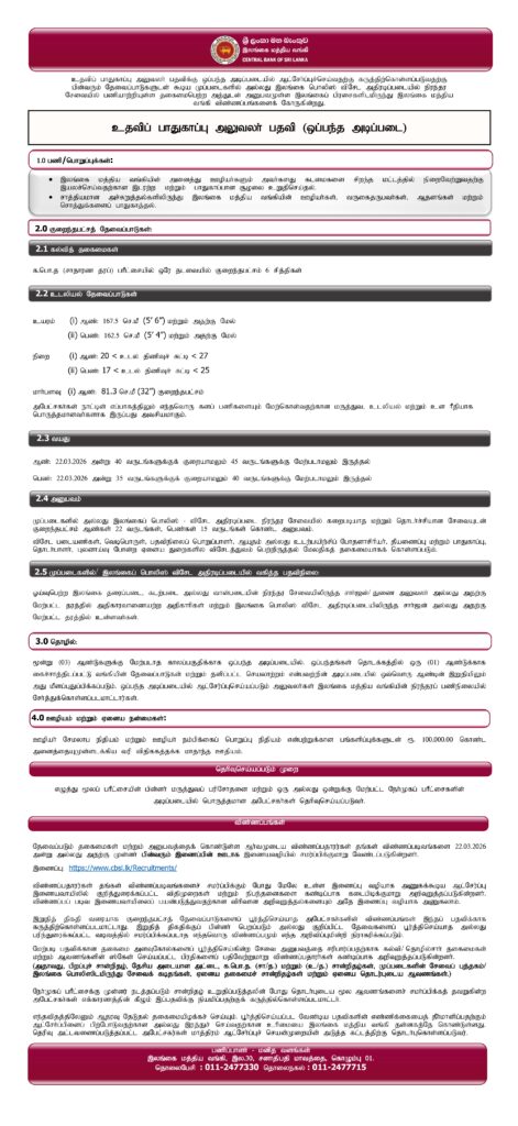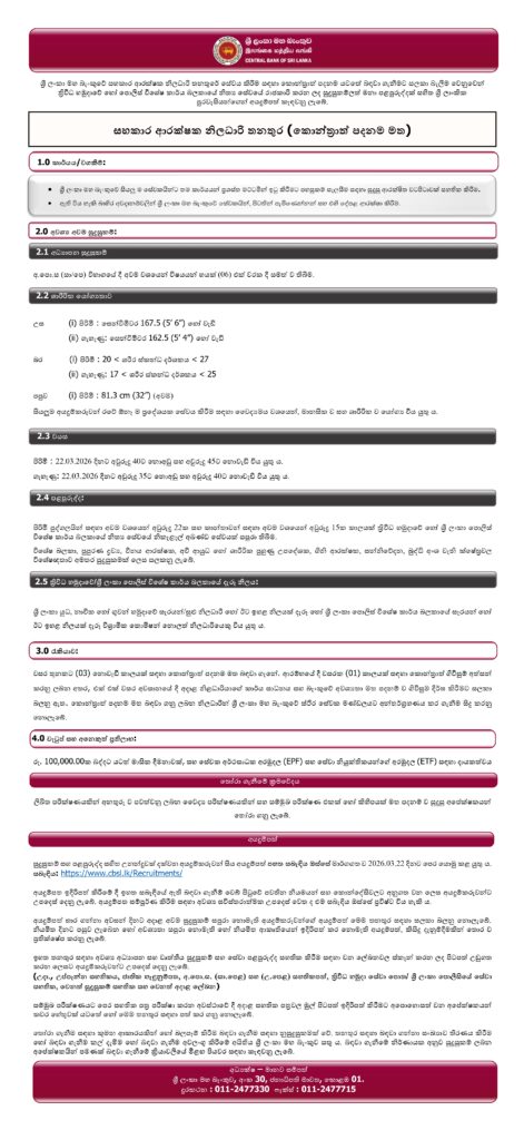 The Central Bank of Sri Lanka (CBSL) invites applications from qualified and experienced Sri Lankan citizens who have served in the Tri Forces or Special Task Force (STF) of Sri Lanka Police for the post of Assistant Security Officer (Contract Basis).