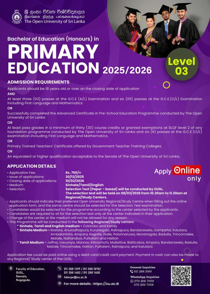 Calling Applications for Bachelor of Education (B.Ed) (Honours) in Primary Education Degree Programme (Level 03) – Academic Year 2025/2026 Conducted by Faculty of Education, The Open University of Sri Lanka (OUSL)