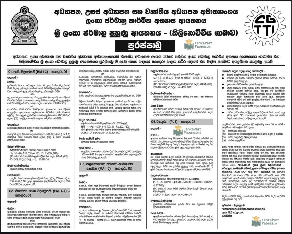 Applications are invited for Government Vacancies at Sri Lanka German Training Institute (CGTTI)Kilinochchi Branch for 2026.