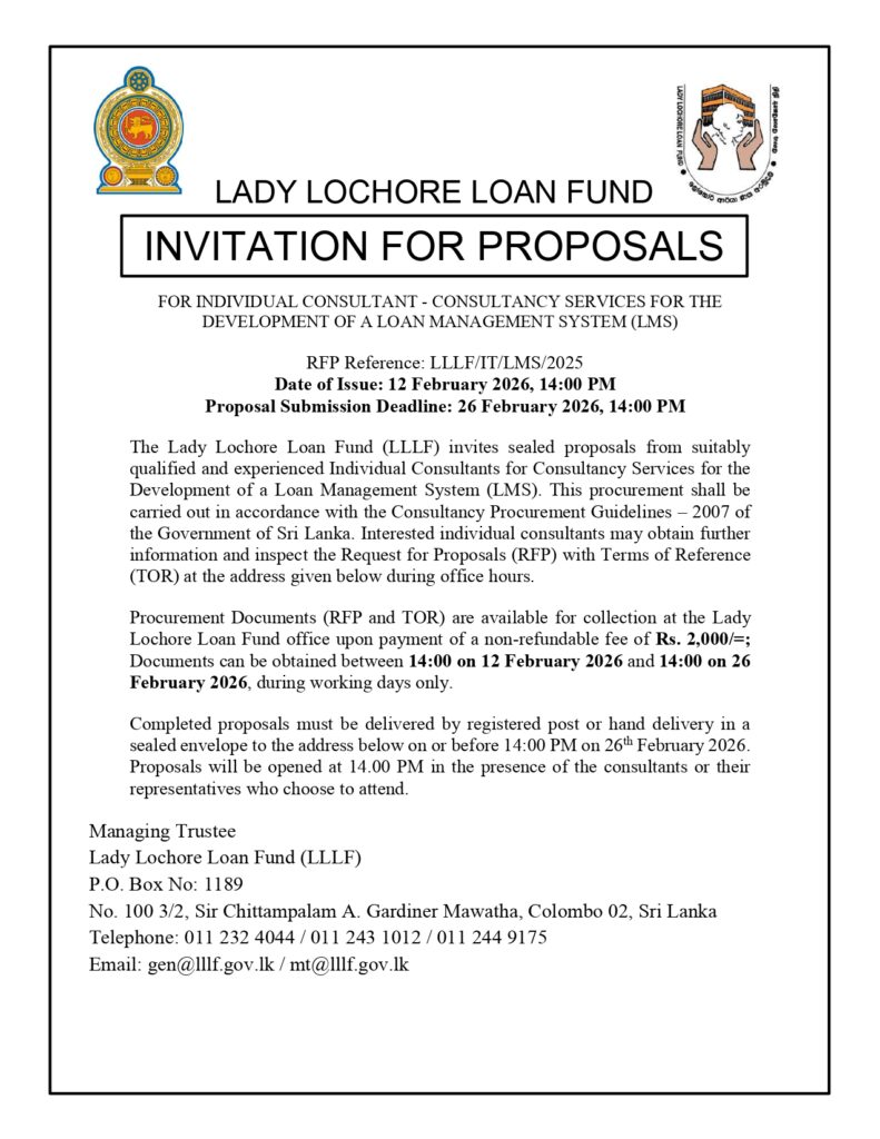 The Lady Lochore Loan Fund (LLLF) invites sealed proposals from suitably qualified and experienced Individual Consultants to provide consultancy services for the Development of a Loan Management System (LMS).
