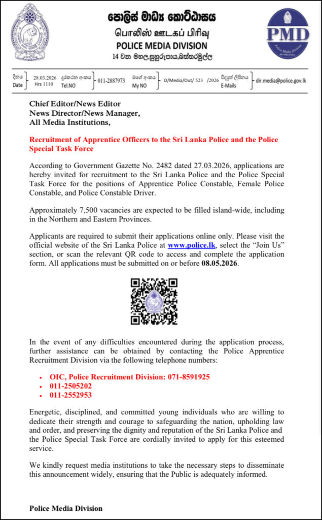 Applicants must submit their applications online only via the official website www.police.lk under the “Join Us” section or by scanning the relevant QR code.