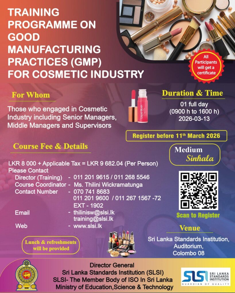 Training Programme on Good Manufacturing Practices (GMP) for Cosmetic Industry – 2026 Sri Lanka Standards Institution (SLSI)